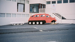 ![]() Vatnajökul, Europas största glaciär, sedd ovanifrån med flygplanets skugga! | ![]() I Höfn tillbringade vi natten på en internatskola (det var ju sommarlov för eleverna). Här kunde vi ta en promenad på egen hand på kvällen och gick ut på en lång brygga i hamnen. Det skulle vi inte ha gjort! Islands alla tärnor blev fly förbannade och jagade bort oss! | ![]() I Höfn fotade vi också detta fordon. Bandvagn med slädar fram och pulka där bak. Praktiskt på Island! |