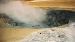 ![]() Här har man ett kraftverk som gör elektricitet av de varma ångorna från de geotermiska källorna. | ![]() Det är ett otrevligt men fascinerande ställe att vara på. Värmen från sådana källor används för uppvärmning av bostäder och växthus. | ![]() Jättestora fält med stelnad lava. |