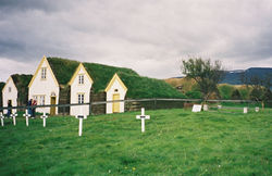 ![]() På eftermiddagen fortsätter vi norrut i svart stenöken mellan vita glaciärer och klarblå sjöar! Bussen stannar och vi klär av oss i pinande kall blåst och småregn. Vi ska bada! En varm källa förenar sig med en iskall bäck och i skarven är vattnet precis lagom varmt! Underbart!!! | ![]() Efter en natt i Hunavatnsysla vid havet på norra Island åker vi österut. Vi stannar i Gaumbaer för att besöka ett torvhus-museum. | ![]() På bilden ser vi lite nyare hus till vänster och äldre hus till höger. |