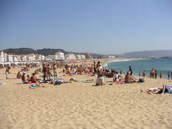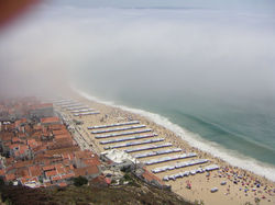 ![]() På väg upp ser vi den mäktiga branten och klippan som hänger ut över havet. I havet utanför finns en djuphavsgrav som ibland skapar enorma vågor. Hit kommer surfare från hela världen. En hawaiiansk surfare har satt världsrekord i "högsta vågen" här! | ![]() Väl uppe har vi fin utsikt och inser att stranden är lång! | ![]() På eftermiddagen går vi till marknaden i Nazaré. |