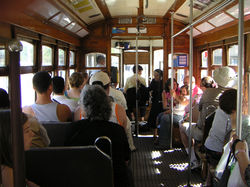![]() Vi har kommit till Lissabon och checkat in på vårt hotell för en natt. Vi börjar med en rundtur med spårvagn. | ![]() Mitt i en vägkorsning stannar plötsligt spårvagnen. Vagnens elledningar har på något mystiskt sätt trasslat in sig i de ledningar som går i luften. Föraren går ut och gör något (vad?) och vi kan åka igen. | ![]() Vi bestämmer oss för att besöka Lissabons citadel med Castelo de Sao Jorge som ligger på höjden. |
