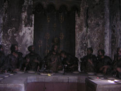 ![]() Vi börjar gå en serpentinväg upp mot kyrkan Bom Jesus. Vid varje vägkrök finns ett sådant här litet kapell som visade sig fungera som "tittskåp"! | ![]() "Tittskåpen" visade scener ur Jesu liv, allt skulpterat i naturlig storlek. Här är sista måltiden med lärjungarna. | ![]() Golgatavandringen. |