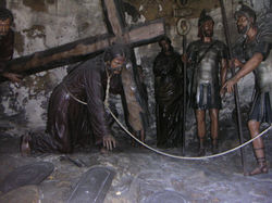 ![]() Jesus spikas fast på korset. | ![]() Jesus tas ner från korset och ska begravas. Alla scenerierna är mycket detaljrika och vackra. | ![]() När serpentinvägen tar slut är det 600 trappsteg upp till kyrkan Bom Jesus. |